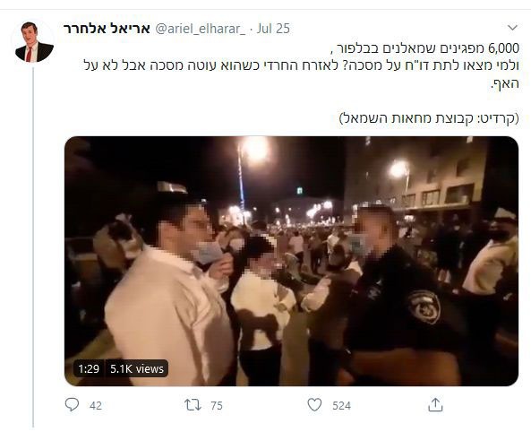 כמעט כל יום התקשורת הארצית מפרסמת מקרים בהם חרדים מתעמתים עם שוטרים, בעיקר בשל עטיית מסיכה במרחב הציבורי, ובחלק מהמקרים החרדים מוצגים באופן לא חיובי בלשון המעטה אריאל אלחרר (31) מאשדוד החליט שלא להחריש, העלה סרטון מקומם אחד בחשבון הטוויטר שלו, שהפך מהר מאוד לוויראלי, ומשם הדרך הייתה קצרה לקבל "מבול" של מקרים דומים מכל הארץ אלחרר אמר לעיתון "המגזין": "מרוב תיעודים ופניות שקיבלתי הפלאפון שלי פשוט קרס, עד שנאלצתי לרכוש מכשיר חדש, ורק אז הבנתי את גודל המצוקה והתחושה הקשה בקרב המגזר החרדי"