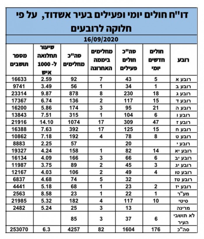 176 חולים חדשים בקורונה ביממה האחרונה, הצטרפו לרשימה הזו, ולעומתם 82 חולים הבריאו מהנגיף ביממה האחרונה. בסך הכל בעיר אשדוד החלימו 4257 תושבים. רובע ז' הוא הרובע עם מספר החולים הגדול ביותר בעיר – עם 309 חולי קורונה.