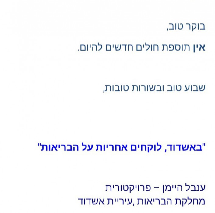 מייל פנימי של פרויקטורית מחלקת הבריאות בעיריית אשדוד שהגיע ליידנו מבשר על כך שביממה האחרונה עד שעות הבוקר לא נמצאו חולי קורונה בעיר, כאשר ענבל היימן כותבת בו "אין תוספת חולים חדשים להיום, שבוע טוב ובשורות טובות".
