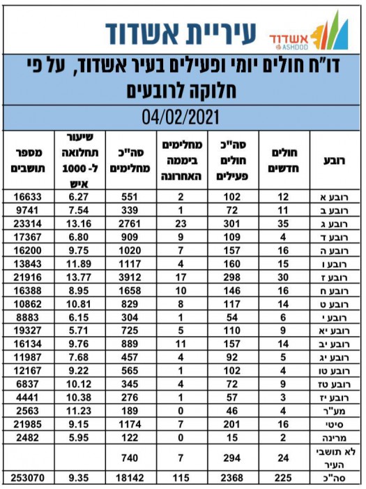 על פי הדו"ח היומי של חולים מאומתים שפרסמה עיריית אשדוד. בעיר 2368 חולים בנגיף. מנגד החלימו 115 חולים. רובע ג' הוא הרובע "האדום" ביותר.