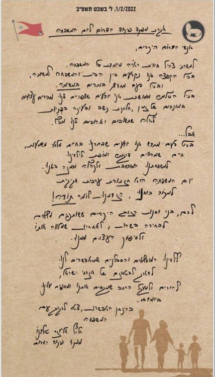 "אנשי הדרום היקרים, למשרתי צה"ל זווית ראיה מיוחדת על המשפחה. בכל הקפצה אנו נקרעים בין הבית והמשפחה למשימה, ובכל פעם מחדש בוחרים במשימה. בכל הסלמה ממושכת אנו יודעים שצפויים לנו מחירים עצומים במונחים של זמן, חלוקת קשב ובעיקר בפניות לאלה שחשובים ואהובים לנו מכל. אבל, בכל פעם מחדש אנו יודעים שבחרנו בחיים מלאי משמעות, חיים שמהווים דוגמא ומופת לילדינו, למשפחתנו המורחבת ולקהילה ממנה באנו. יום המשפחה הוא תזכורת ערכית חגיגית למקור כוחנו, הזדמנות לומר תודה! לכם, בני ובנות הזוג היקרים ששותפים מלאים לבחירה בשירות, לאחריות שמלווה אותו ולסיפוק העצום ממנו. לילדינו המופלאים והסבלניים שמאפשרים לנו לדאוג לביטחונם של אזרחי ישראל, להורים ולמעגל הרחב שמגבים אותנו ומחפים עלינו. בהינתן האפשרות, צאו לחגוג עם המשפחה".