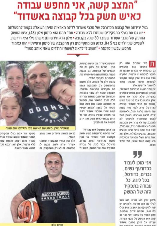 סימון אלון משמש כאפסנאי במכבי אשדוד כדורסל כבר 30 שנה. לאחרונה ירדה הקבוצה לארצית, והוא נשאר כרגע ללא פרנסה. הכתבה על סיפרו של אלון, שהוא ורעייתו חרשים ולהם שני ילידם קטנים, שומעים, פורסם בעיתון ה'מגזין' אשדוד.