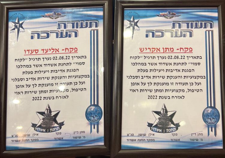 בטקס החגיגי לקראת השנה החדשה הבעל"ט, מסורת ארוכת שנים שמקיימים ביחידות השיטור, המפקחים מתן אקריש ואליעד סעדו נקראו לבמה יחד עם מפקדיהם, וזכו לקבל תעודת הערכה על שירות אדיב ומקצועי לתושב.