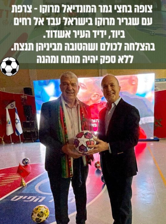 ההזמנה הזו קשורה גם למערכת היחסים המצוינת והחמה השוררת בין מרוקו לבין העיר אשדוד במיוחד. גם ראש העיר אשדוד, ד"ר לסרי יצר קשרים מיוחדים עם רבים בממשל המרוקני ורק בשבוע שעבר הגיע לאשדוד שגריר מרוקו בישראל עבד אל־רחים ביוד. השגריר בחר לצפות, מכל מקום אחר בארץ, במשחק חצי גמר המונדאיל בין מרוקו לצרפת עם עוד מאות מוזמנים, דווקא בעיר בבית הספר על שם יצחק רבין. בין המוזמנים המיוחדים היה גם כמובן ראש העיר אשדוד ד"ר יחיאל לסרי, שלו ולשגריר כאמור יש יחסים מצוינים ואמוד קרובים. הקרבה הזו אגב גורמת לא פעם לשגריר לקדם בכל פעם את ענייניה של אשדוד במרוקו.