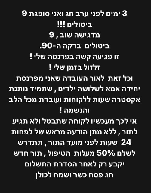 ללי וויסגורס, בונת הציפורניים (מָנִיקוּרִיסְטִית) מאשדוד, נמאס. היא החליטה שהיא עושה סוף לכל הלקוחות שלה שלפני הפסח מבטלות לה תורים לפני ערב בחג.