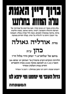 האישה הצעירה כבת 24 גב' אודליה כהן לבית משפחת מלול המוכרת בעיר, נפטרה השבת אחרי ימים קשים שעברה. השאירה אחריה בעל ו- 2 ילדים קטנים