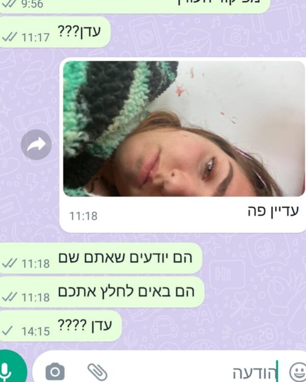 עדן שטיבלמן: "50 מטר, 20 מטר, 10 מטר…" אנחנו מרימים את הראש ורואים את הצבא שלנו, קמים עם הידיים למעלה "אנחנו ישראלים, ישראלים", ובוכים את חיינו. תודה רבה לכל הניסים וההשגחה עלינו. כמה זה היה קרוב כל פעם כל פעם כל פעם. הסתכלתי על אחותי בזמן שהיינו שם וכל מה שחשבתי היה "אלוהים, אמא שלי הולכת לאבד שתי בנות עכשיו, בבקשה תשמור עלינו".