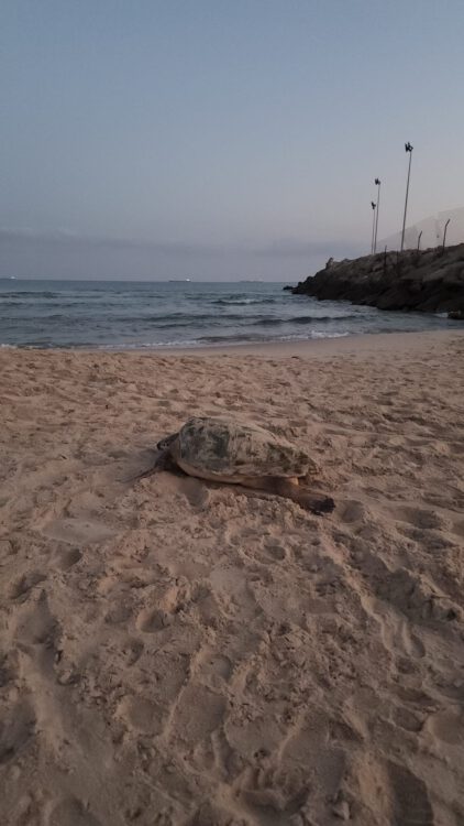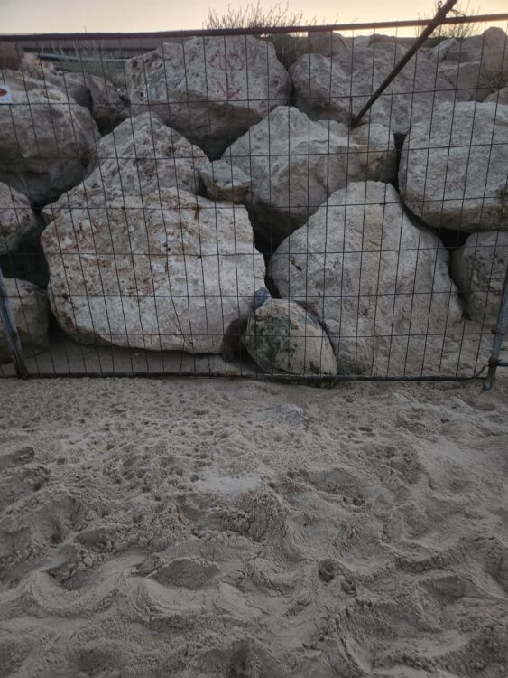 צבת ים חומה שעלתה להטיל בחוף בעיר נלכדה בין מסלעת המרינה לגדר מתכת וניצלה בזכות סורקי החוף