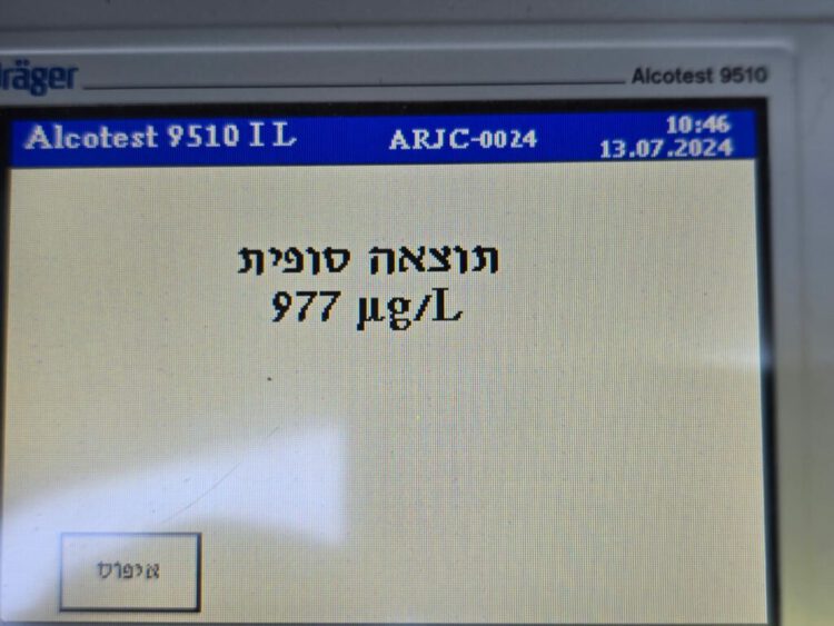 נהג תושב אשדוד (48) נעצר בגין מעבר ברמזור אדום ובבדיקת שכרות שנעשתה לנהגת נמצא 977 מ"ג אלכוהול (מעל פי 4 מהרף האסור בחוק)