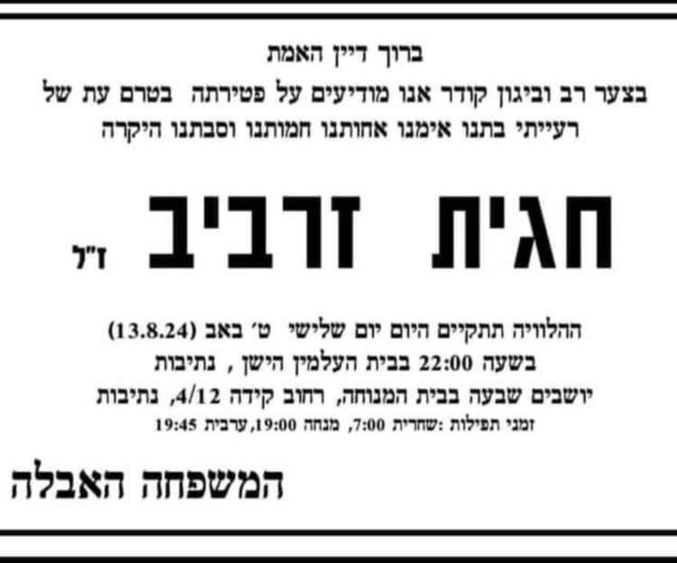אמש לקראת חצות לילה נקברה חגית זרביב בבית העלמין בנתיבות. סיגל דוד – בוקסדורף שבנה למד אצל המנוחה, ספדה לה בפוסט בפייסבוק