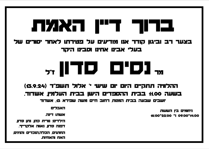 הלוויה תתקיים באולם ההספדים הישן בבית העלמין בשעה 11:00