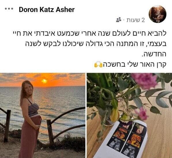 שנה אחרי היום הנורא מכל: דורון כץ אשר, שנחטפה עם בנותיה הקטנות לרצועת עזה ב-7 באוקטובר ושוחררה איתן אחרי 49 ימים בשבי חמאס, פרסמה היום בפוסט מרגש בעמוד האינסטגרם שלה כי היא בהיריון.