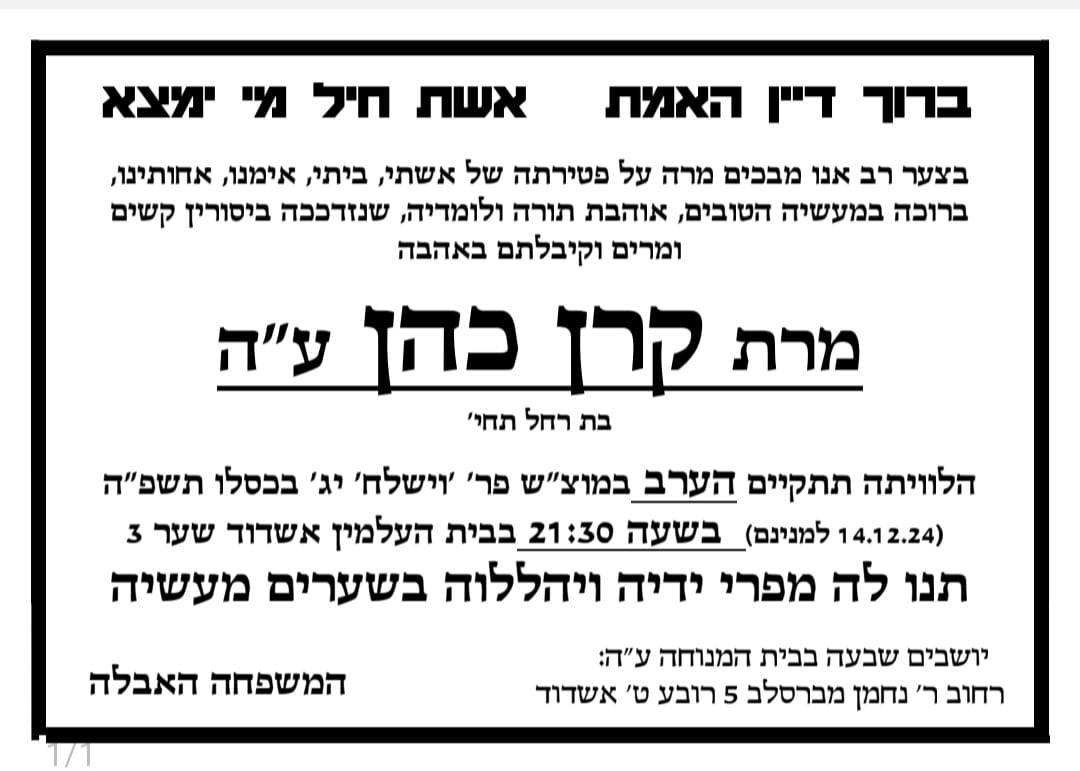 עם צאת השבת בצער רב וביגון קודר הגיע הידיעה המעציבה על פטירתה של האישה הצעירה הגב' קרן כהן ע"ה כשהיא בת 40 שנים בלבד.