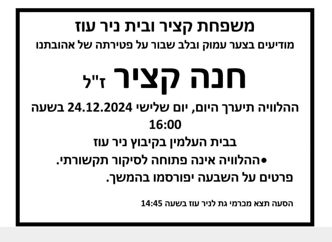בגיל 77 הלכה לעולמה שורדת השבי חנה קציר ז"ל. חנה, נחטפה לעזה על ידי מחבלי חמאס ב-7 באוקטובר מביתה בניר עוז ושוחררה בפעימה הראשונה בנובמבר. בעלה, רמי, נרצח בממ"ד. בנה, אלעד, נרצח בשבי חמאס.