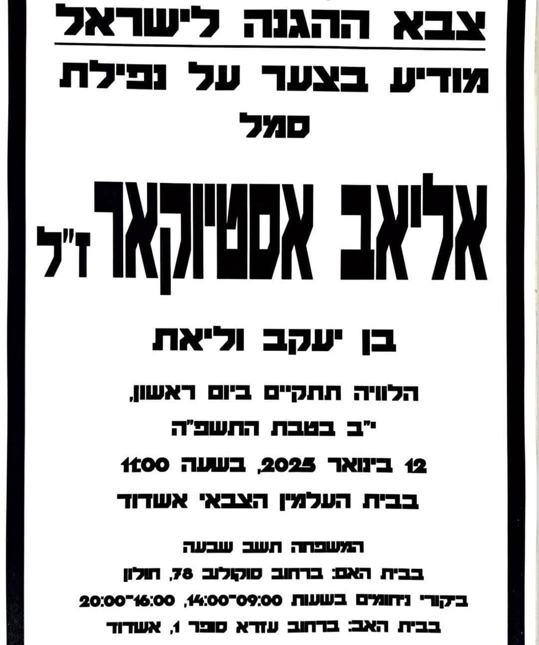 הבוקר פורסם מועד הלוויתו של סמל אליאב אסטיוקאר הי"ד בן 19 מאשדוד.