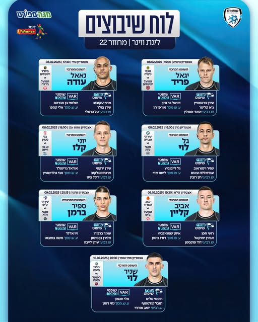 נקבע שופט המשחק במוצאי השבת בין קבוצת מועדון ספורט אשדוד לבין הפועל באר שבע מוליכת הטבלה, במסגרת המחזור ה-22 בליגת העל. מי שינהל את המשחק הוא אביב קליין. המשחק ייערך באצטדיון הי"א (19.30) באשדוד.