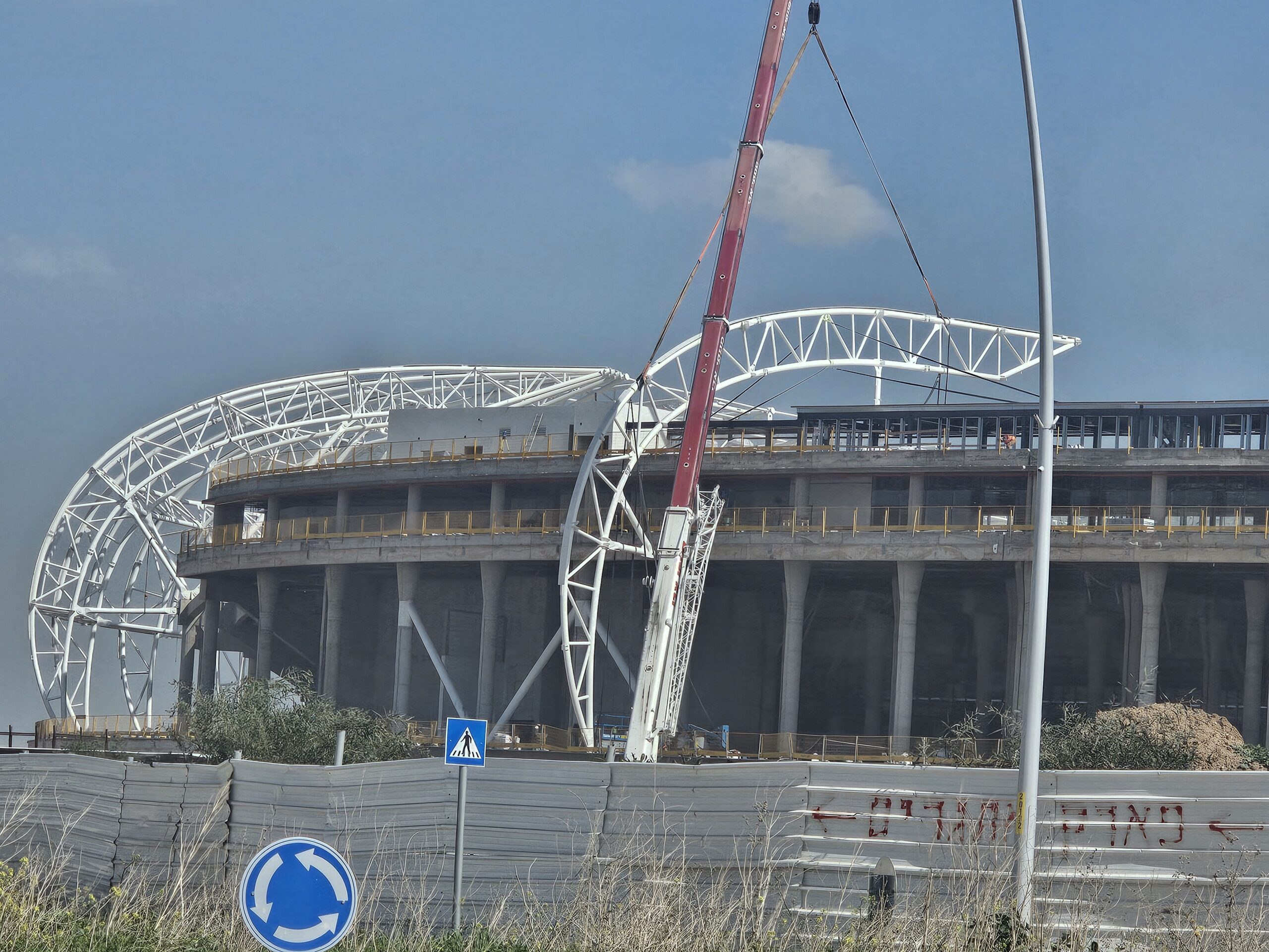 התמונה הבאה מציגה את מצב העבודות הנוכחי באצטדיון. ניתן לראות שהשלד המרכזי של המבנה כבר הושלם, והעבודות על הגג נמצאות בשלבים מתקדמים. סביב המתחם נמשכות עבודות פיתוח שיכללו גם חניונים ותשתיות מודרניות.