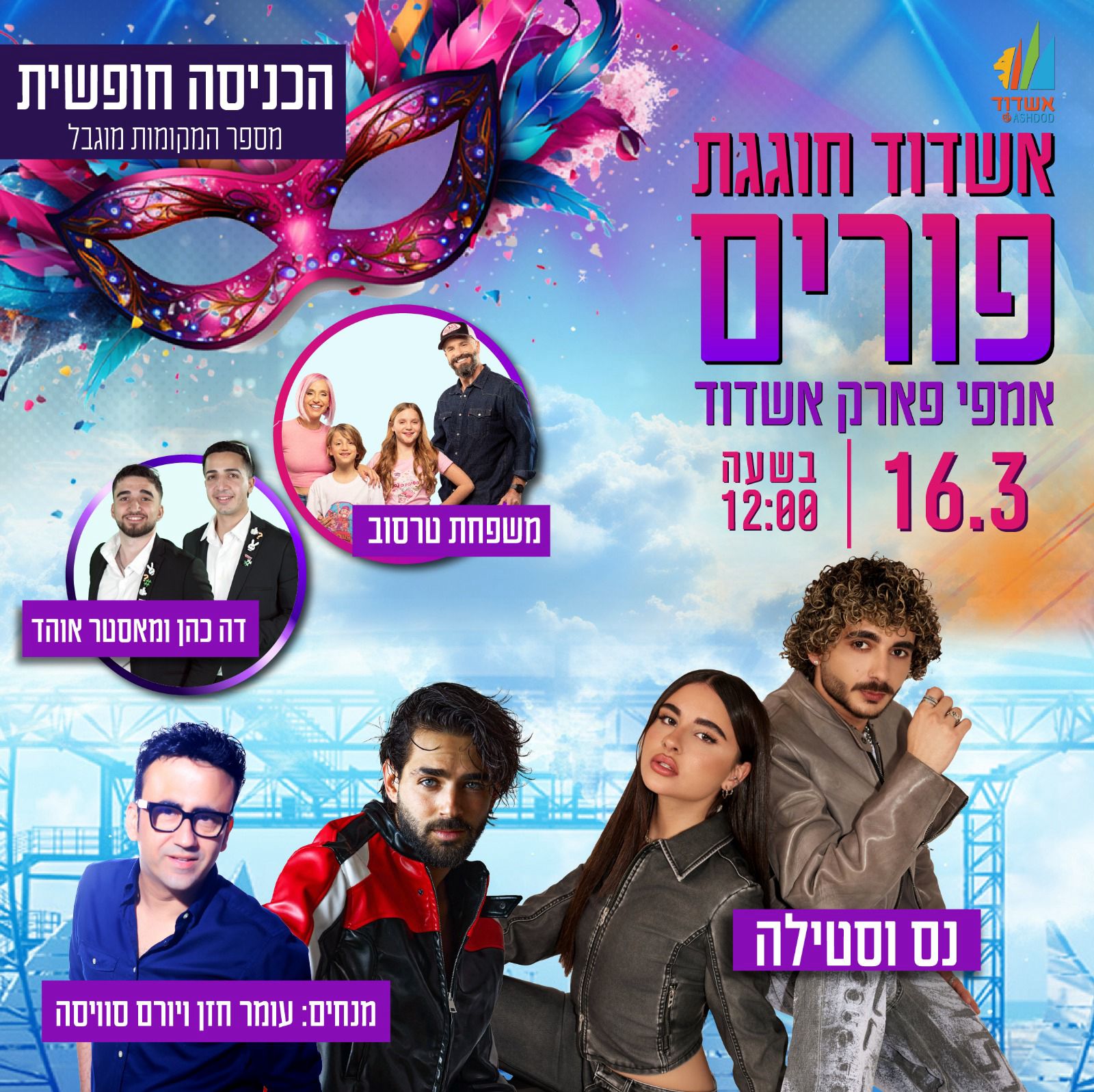 אמפי פארק אשדוד ייצבע בחג הכי שמח בשנה עם כוכבי הילדים והנוער הגדולים ביותר. האירוע המרכזי של החג יתקיים ב-16.3 החל מ-12:00 בצהריים, ועל פי הוראת המשטרה מספר המקומות יהיה מוגבל. הכניסה חופשית.