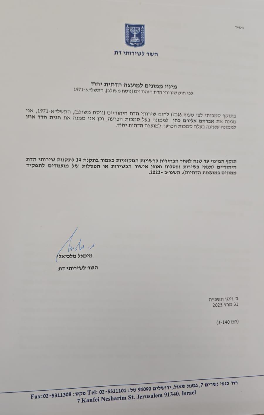תוקף המינוי עד שנה לאחר הבחירות לרשויות המקומיות כאמור בתקנה 14 לתקנות שירותי הדת היהודיים (תנאי כשירות ופסלות ואופן אישור הכשירות או הפסלות של מועמדים לתפקיד ממונים במועצות הדתיות), תשפ"ב-2022 חתימת השר – מיכאל מלכיאלי".