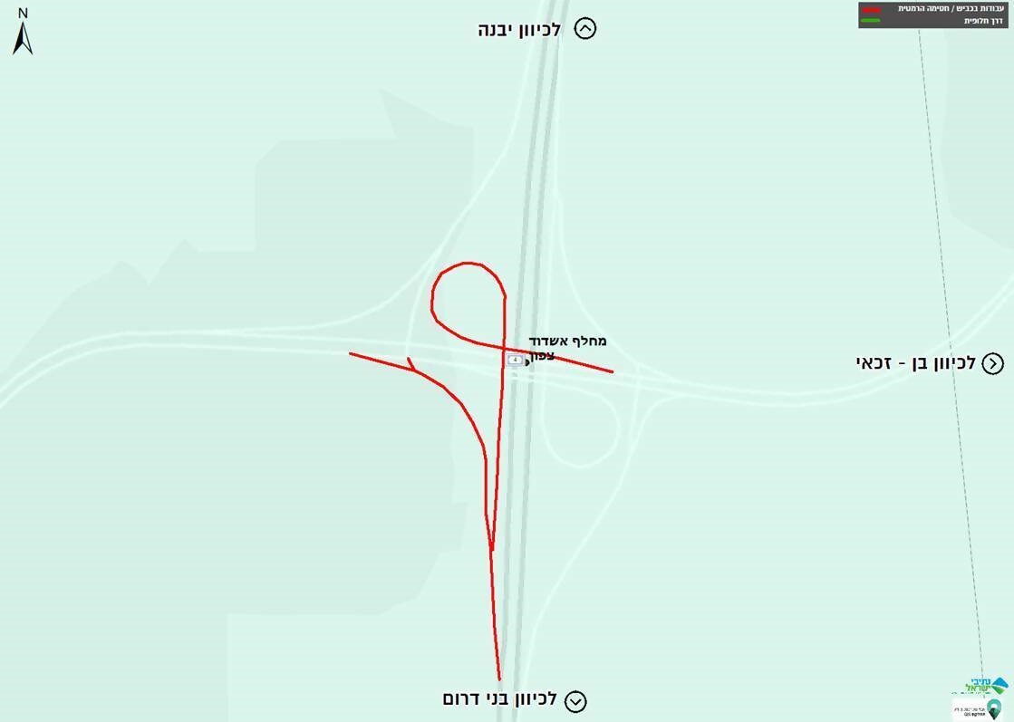 במסגרת העבודות, תוצע לנהגים דרך חלופית כדלקמן: יציאה לכיוון צפון ולהמשיך עד המחלף הבא (יבנה דרום), ביצוע פניית פרסה על גבי המחלף ולצאת לכיוון דרום (אשדוד). שימו לב: ייתכנו עומסי תנועה.