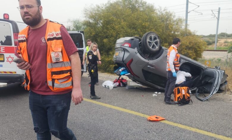צוותי הרפואה של איחוד הצלה העניקו סיוע רפואי ראשוני בזירת תאונה בכביש 4 סמוך למחלף יבנה. ד"ר נחשון לביא רופא איחוד הצלה והחובשים מישאל חדד, שמחה מוזסון ודניאל בוקובזה מסרו: "מדובר ברכב שהתהפך. נהגת הרכב בת 62 נפצעה באורח בינוני. לאחר הסיוע הרפואי הראשוני שהענקנו לה בזירה היא פונתה לבית החולים אסותא באשדוד". צילום: איחוד …