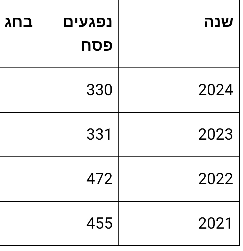 ישראלים רבים ינצלו את חופשת הפסח הקרובה לטיולים. מזג האוויר האביבי והנעים, החופשה הארוכה ממוסדות החינוך והרצון לטייל יובילו רבים לבלות שעות רבות בדרכים ואיתם מגיעה גם הסכנה להיפגעות בתאונה. 390 בני אדם נפגעים בממוצע בכל שנה בתאונות דרכים במהלך חופש חג הפסח, כך עולה מנתוני עמותת אור ירוק המבוססים על נתוני הלמ"ס. מהנתונים עולה עוד כי 330 בני אדם נפגעו בתאונות דרכים במהלך חג הפסח בשנת 2024.