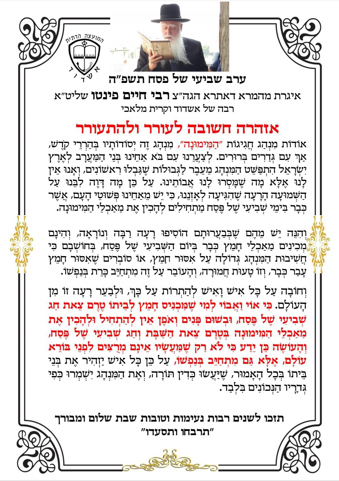 לקראת חג 'המימונה': רב העיר פרסם איגרת לתושבי העיר בענין איסור הכנת מאכלי חמץ בשבת והחג