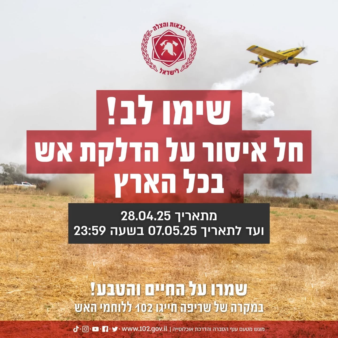 בשל תנאים קיצוניים המעלים את הסבירות להתפתחות שריפות והתפשטותן, נציב כבאות והצלה לישראל, רב טפסר אייל כספי, חתם על צו איסור הדלקת מדורות והבערת אש בכל הארץ החל מאתמול (28.4.2025) ועד לתאריך 07.5.2025 בחצות.