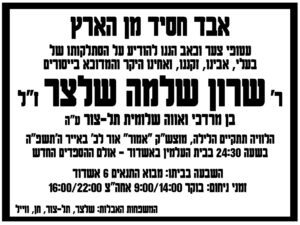 אבל כבד בעיר אשדוד. במהלך השבת הלך לעולמו הלב שלמה שלצר ז"ל בעיר. הלוויתו תתקיים הלילה בעיר בהשתתפות קהל רב