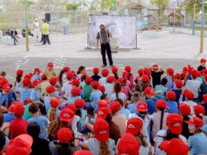 כשליחו של הרבי הרה"ח ר' מנחם עמאר ניצל את הזמן בתהלוכה וזיכה את האנשים במצוות 'הנחת תפילין' בפינת הדרכים שנאותו בשמחה לבקשתו. בדבריו בפני ילדי בתי הספר הסביר את מעלתו של יום לג' בעומר בהסתלקותו של התנא רבי שמעון בר יוחאי שהעביר את המשך קיום התורה בעם ישראל.