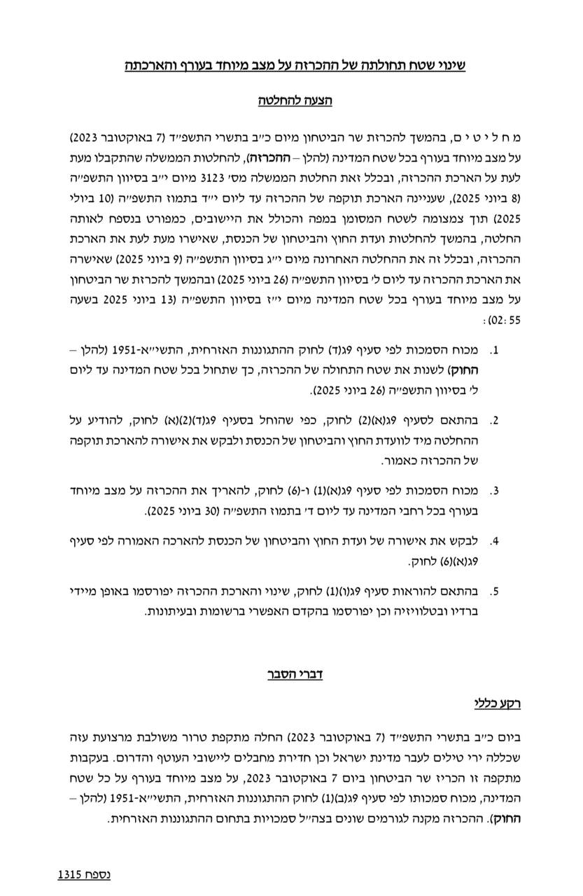 בעקבות המשך הלחימה והמצב הבטחוני שרי הקבינט הכריעו ואישרו כי המצב המיוחד בעורף יוארך עד 30.6.