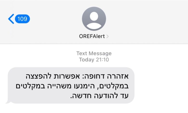 > "אזעקה דחופה: אפשרות להפצצה במקלטים, הימנעו משהייה במקלטים עד להודעה חדשה."
