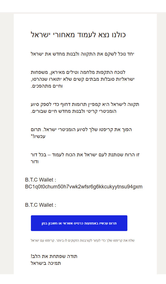 המיילים שכתובים בעברית קלוקלת ונראה כי השתמשו בגוגל טרנסלייט, מופיעים מסרים כמו "כולנו נצא לעמוד מאחורי ישראל" ו"הפוך את הקריפטו שלך לתקווה", ומצורפת כתובת ביטקוין (BTC Wallet) לצורך העברת כספים. חלק מההודעות אף כוללות כפתור שמזמין לתרום באמצעות כרטיס אשראי או חשבון בנק.