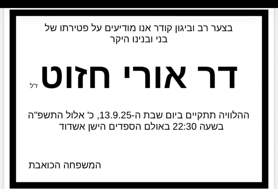הלוויתו של דר אורי חזוט תתקיים היום בבית העלמין באשדוד בשעה 22:30
