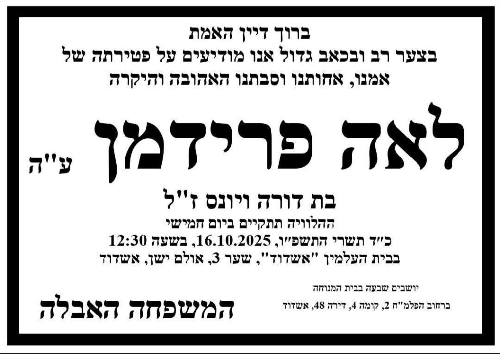 לאה פרידמן, תושבת רובע ג' ופנסיונרית של המשטרה, הלכה לעולמה הבוקר ותובא למנוחות בבית העלמין באשדוד בשעה 12:30