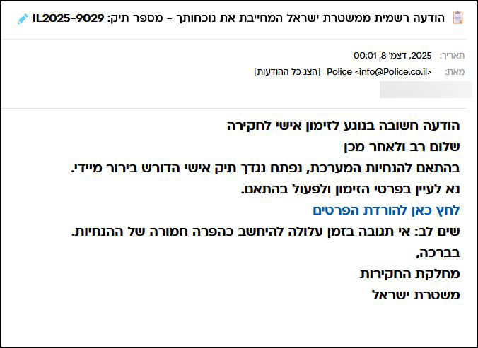 בדיקה מעלה כי כתובת השולח אינה רשמית. משטרת ישראל משתמשת בדומיין police.gov.il בלבד, ואינה שולחת זימונים לחקירה באמצעות קישורים במיילים. בנוסף, ההודעה אינה כוללת פרטים מזהים כמו שם מלא, מספר תיק אמיתי או פרטי תחנה, סימן מובהק לניסיון הונאה.
