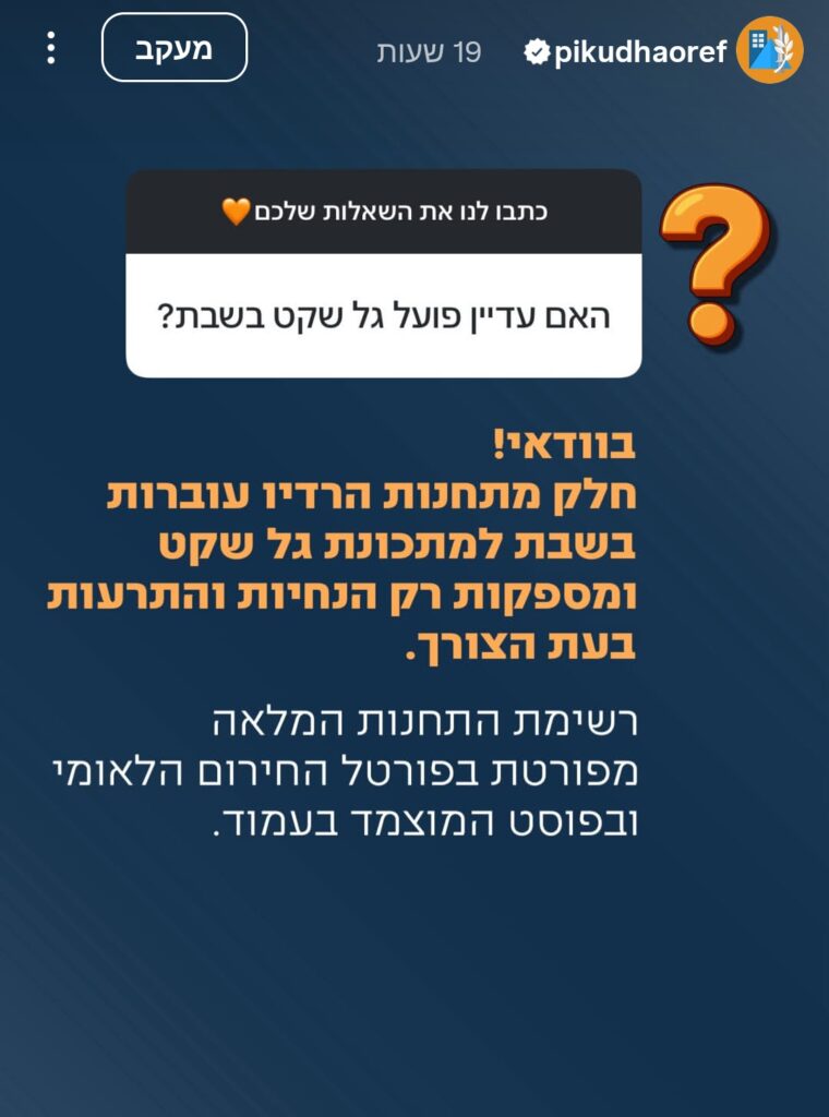 על רקע המצב הביטחוני המתוח והכוננות הגבוהה, פיקוד העורף מעדכן כי, במהלך השבת הקרובה יופעלו תחנות רדיו במתכונת "גל שקט". השירות נועד לאפשר לציבור שומרי השבת לקבל התרעות והנחיות מצילות חיים בזמן אמת, מבלי להאזין לשידורים שוטפים.