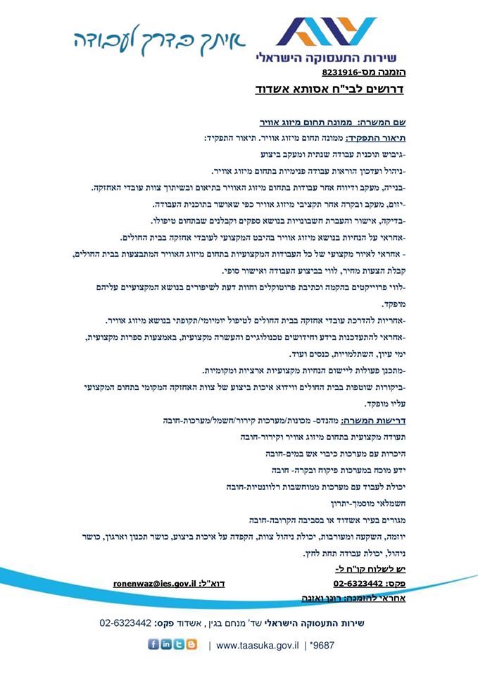 שירות התעסוקה פירסם היום בעמוד הפייסבוק שלו שהחל תהליך גיוס עובדים למספר משרות עבוד בית החולים אסותא אשדוד שיפתח את שעריו ב2017