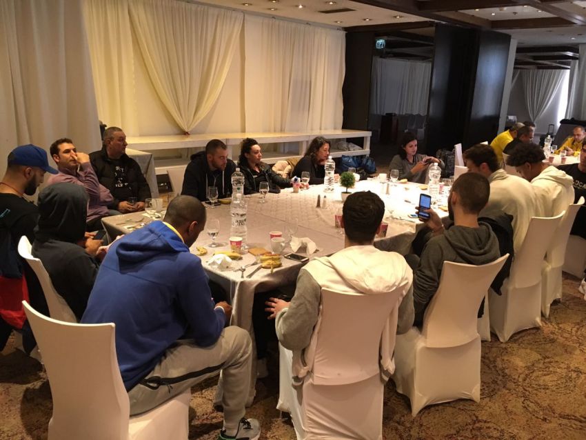 רגע של שקט לפני הסערה. שחקני אשדוד בלובי המלון, לרגע של ״קפה ועוגה״.