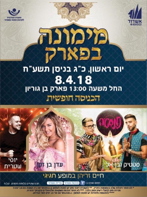 מחר, יום ראשון ה- 8.4 תערך בפארק בן גוריון חגיגת מימונה לתושבי העיר אשדוד. בין היתר יופיעו עדן בן זקן, סטטיק ובן אל ואחרים. חיים זריהן ויוסי שטריתי יופיעו אף הם ויוסיפו לחגיגה.