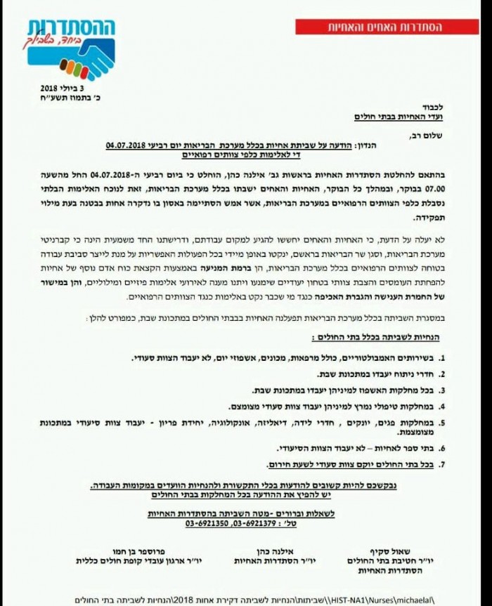 השביתה היא כמחאה על דקירת אחות בבית החולים אסף הרופא. השביתה תכלול גם מרפאות, מכונים, אשפוזי חום והצוות הסיעודי לא יעבוד. בנוסף חדרי הניתוח ומחלקות האשפוז, יעבדו במתכונת שבת. במחלקות פגים ויונקים, טיפול נמרץ, חדרי לידה, דיאליזה אונקולוגיה ויחידת הפריון, יעבדו במתכונת מצומצמת.