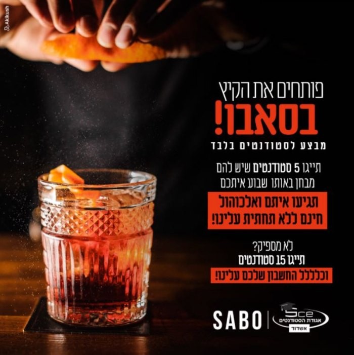 יוני – אוגוסט נחשבים לחודשי המבחנים עבור סטודנטים רבים שחלק ניכר מהם תושבי העיר. בין מבחן חוזר לעבודת הגשה הזמן ליציאות מוגבל והרצון לנקות את הראש כמעט ולא מתממש. בימים האחרונים פרסמו סטודנטים ברשתות החברתיות על מבצע מטורף לפיו ה SABO, בר הקוקטיילים בשדרת מרטין בובר בעיר, מעניק לסטודנטים חשבון פתוח.